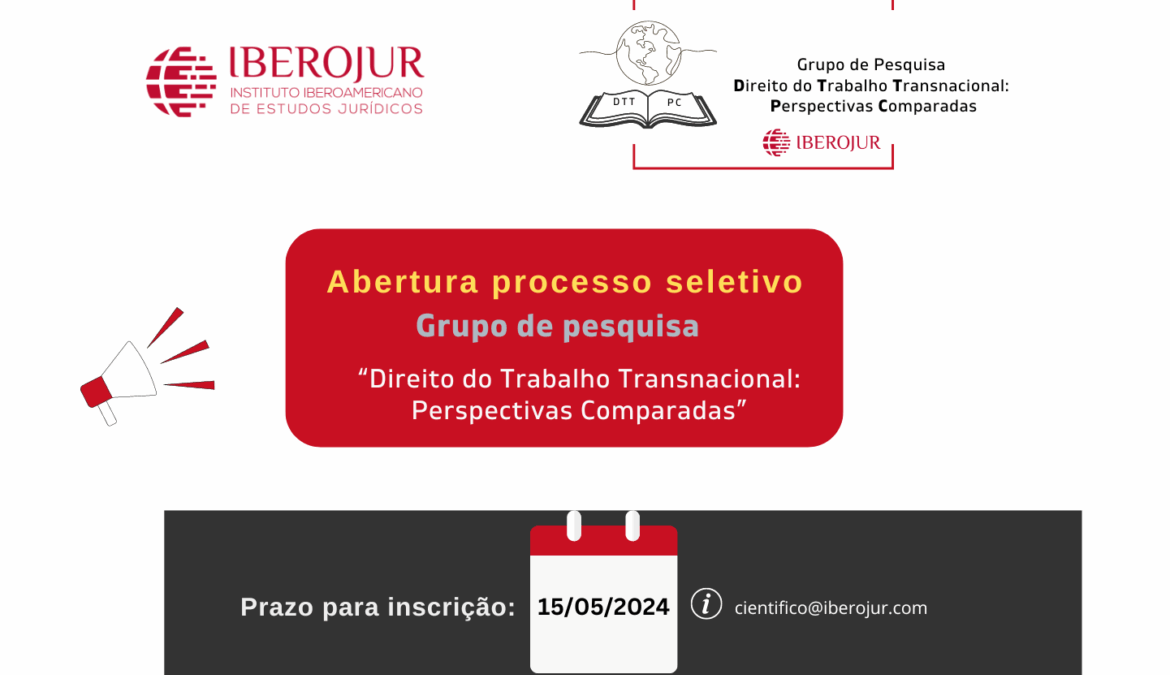 O Grupo de Pesquisa Direito do Trabalho Transnacional: Perspectivas Comparadas (DTT-PC), vinculado do Instituto Iberoamericano de Estudos Jurídicos (IBEROJUR), torna público, a todos(as) os(as) interessados(as), o edital para integração de estudantes e pesquisadores(as) às suas atividades.