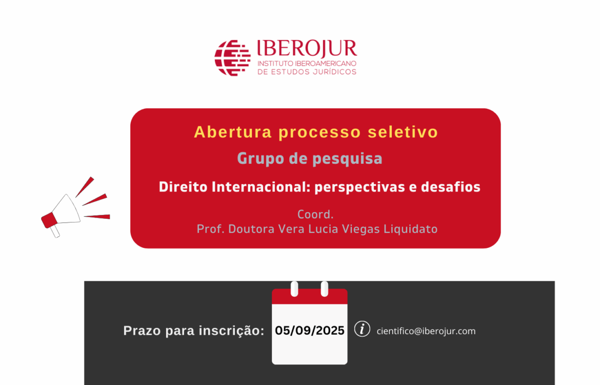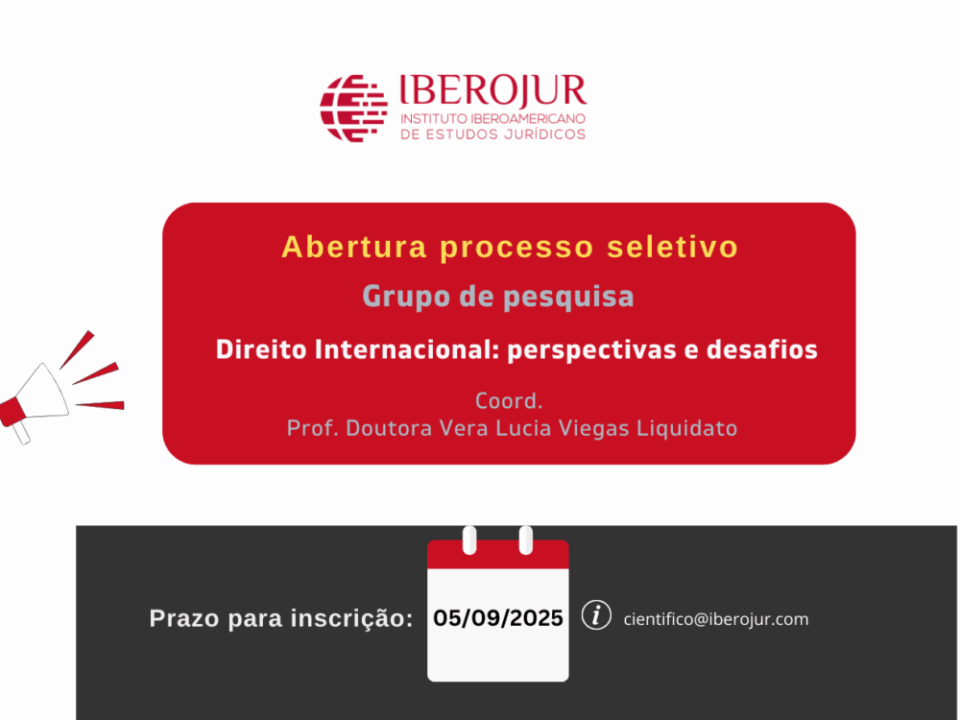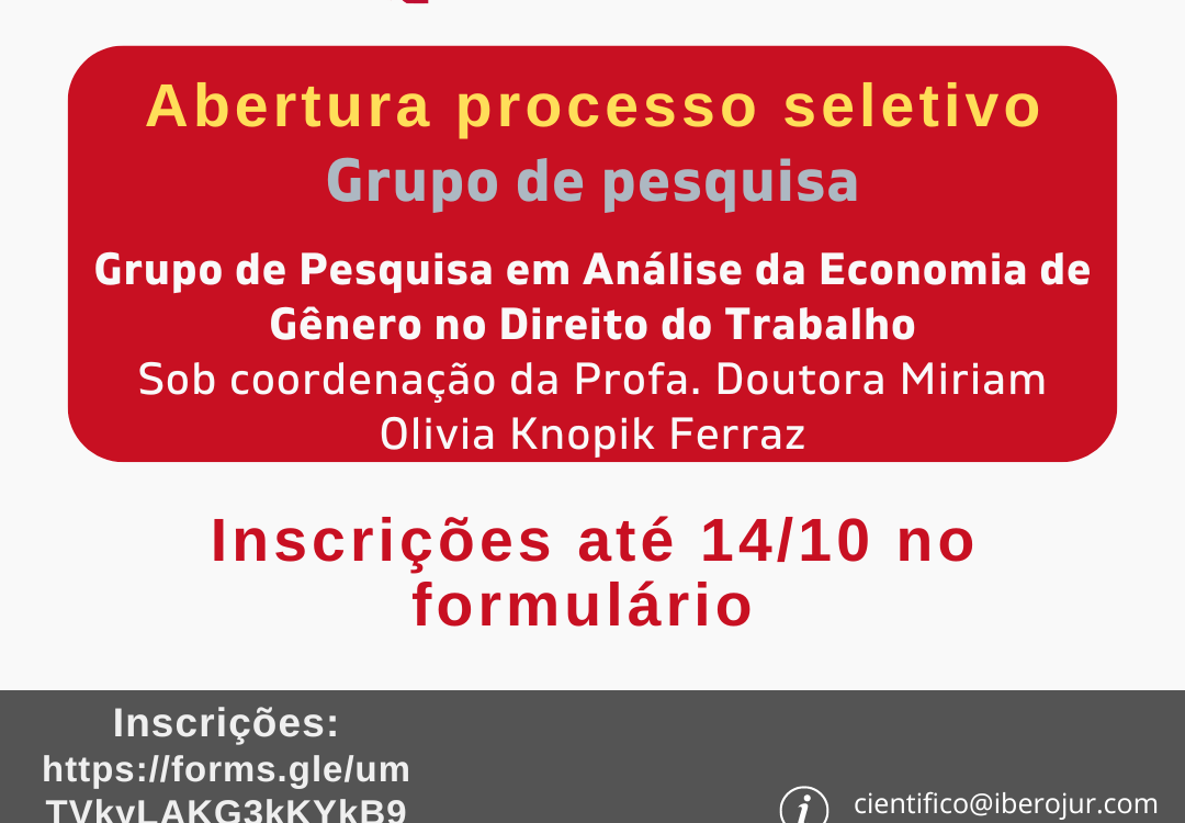 O Grupo de Pesquisa em Análise da Economia de Gênero no Direito do Trabalho, vinculado ao Instituto Iberoamericano de Estudos Jurídicos (IBEROJUR), torna público, a todos(as) os(as) interessados(as), o edital para integração de estudantes e pesquisadores(as) às suas atividades.