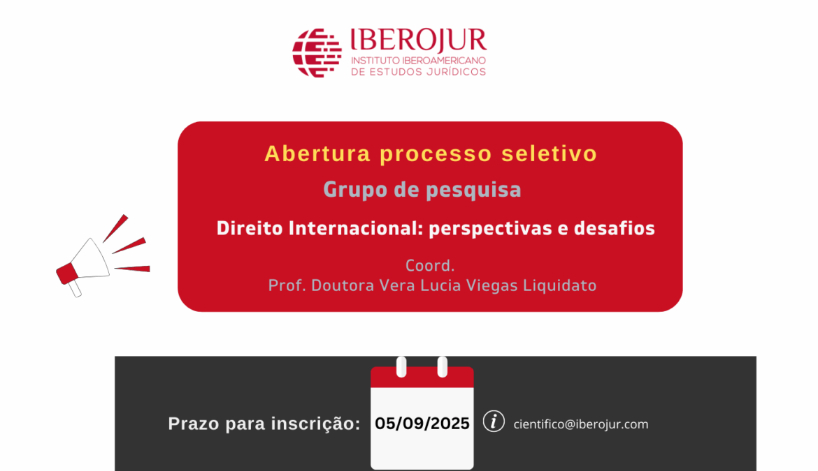 Após um ano exitoso de trabalho, atendendo a pedidos, o grupo de Pesquisa Direito Internacional: perspectivas e desafios, vinculado ao Instituto Iberoamericano de Estudos Jurídicos (IBEROJUR), torna público a todos(as) os(as) interessados(as), o processo de seleção para novos integrantes. Venha ser pesquisador desse renomado Grupo de Estudos.