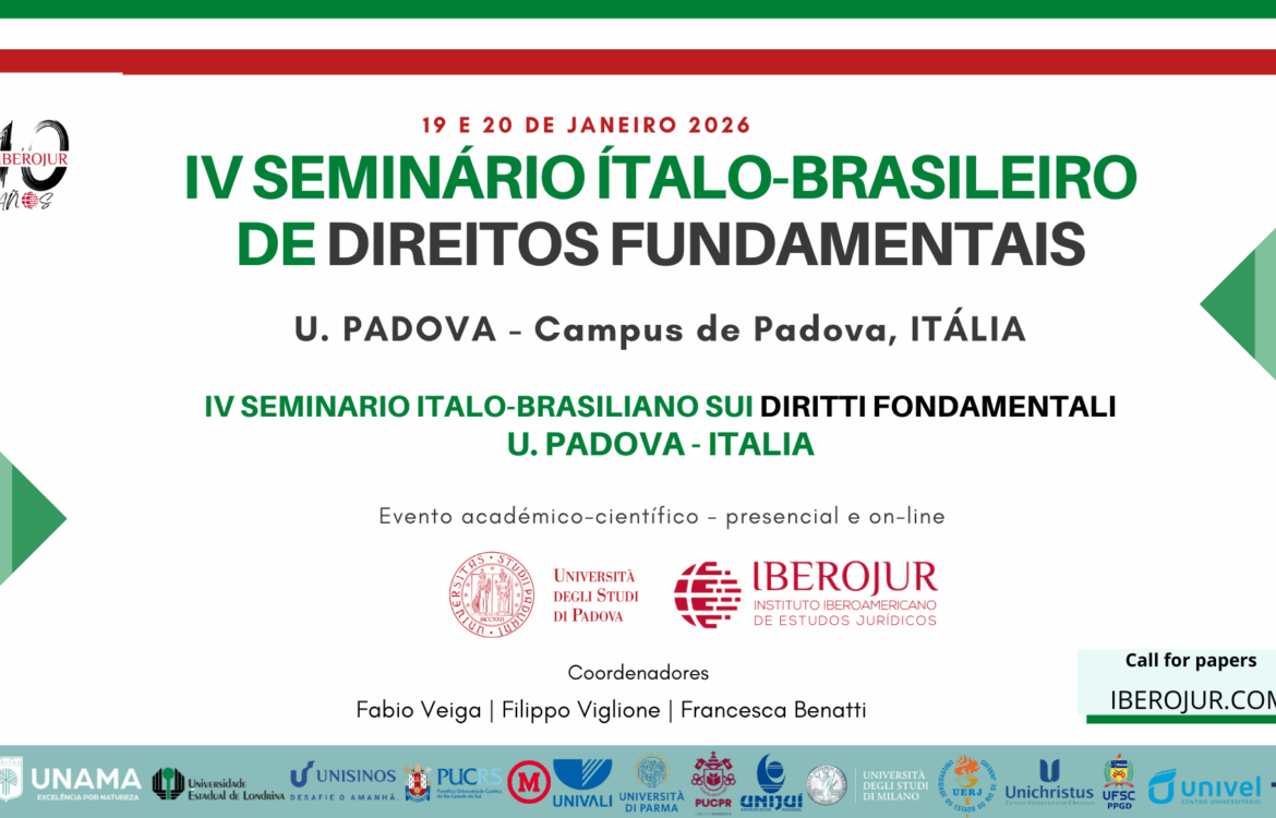 O Instituto Iberoamericano de Estudos Jurídicos e a Università di Padova (Dipartimento di Scienze politiche, giuridiche e studi internazionali – SPGSI) promovem, em conjunto, o IV Seminário Ítalo-brasileiro de Direitos Fundamentais nos dias 19 e 20 de janeiro de 2026.